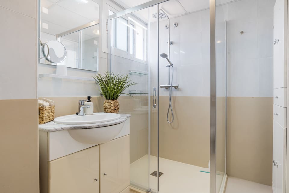 Interior is thoughtfully arranged to maximise space and natural light. Two spacious bedrooms and two well-appointed bathrooms are complemented by bright living area that flows seamlessly onto glass-enclosed terrace. This creates natural extension of living space, ideal for year-round use and effortless indoor-outdoor living.